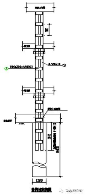 格构柱截面形式为 550×550mm,角钢型号为∠160×16,缀板型号为 500×300×12@600 mm,钢构件连接均为满焊。其中格构柱嵌入基底以下 15m,即钻孔灌注桩长 15m,钢立柱嵌入钻孔灌注桩 3m。钢立柱与钻孔灌注桩主筋焊接,一起吊放,钻孔灌注桩桩径 1200mm,桩身垂直度偏差≤1/300 桩长。