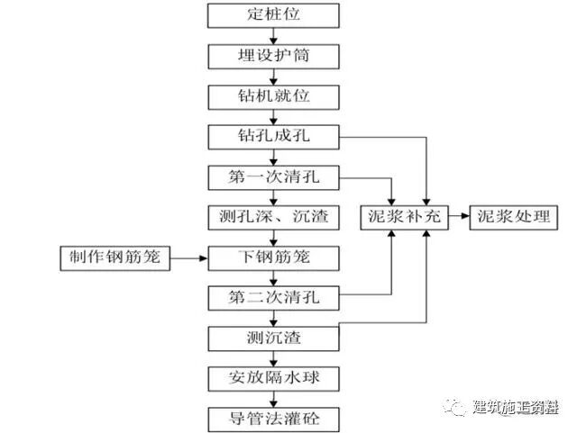 临时格构柱基础钻孔桩成孔采用 SR220C 旋挖钻机。旋挖成孔首先是通过底部带有活门的桶式钻头回转,并直接将其装入钻斗内,然后再由钻机提升装置和伸缩钻杆将钻斗提出孔外卸土,这样循环往复,不断地取土卸土,直至钻至设计深度。对粘结性好的岩土层,可采用干式或清水钻进工艺,无需泥浆护壁。而对于松散易坍塌地层,或有地下水分布,孔壁不稳定,必须采用静态泥浆护壁钻进工艺,向孔内投入护壁泥浆进行护壁。施工工艺见下图: