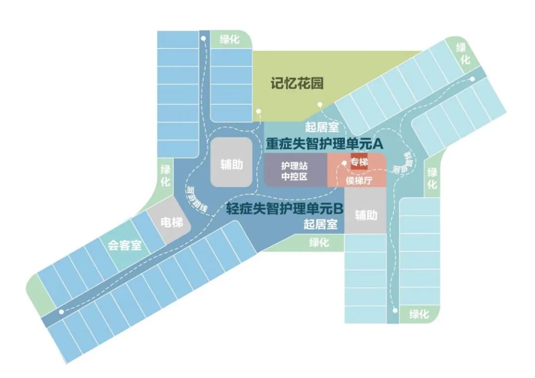 建筑功能通过竖向楼层明晰划分:活力健康老人的居室设置在高楼层,需要专业护理的老人居室安排在低楼层。所有的护理单元内都设置有公共区,区内以街区的形式,布置有公共起居室、餐厅、悠闲娱乐区、会客厅与观景平台,老人在建筑中也可以获得居住在社区内的生活化体验。