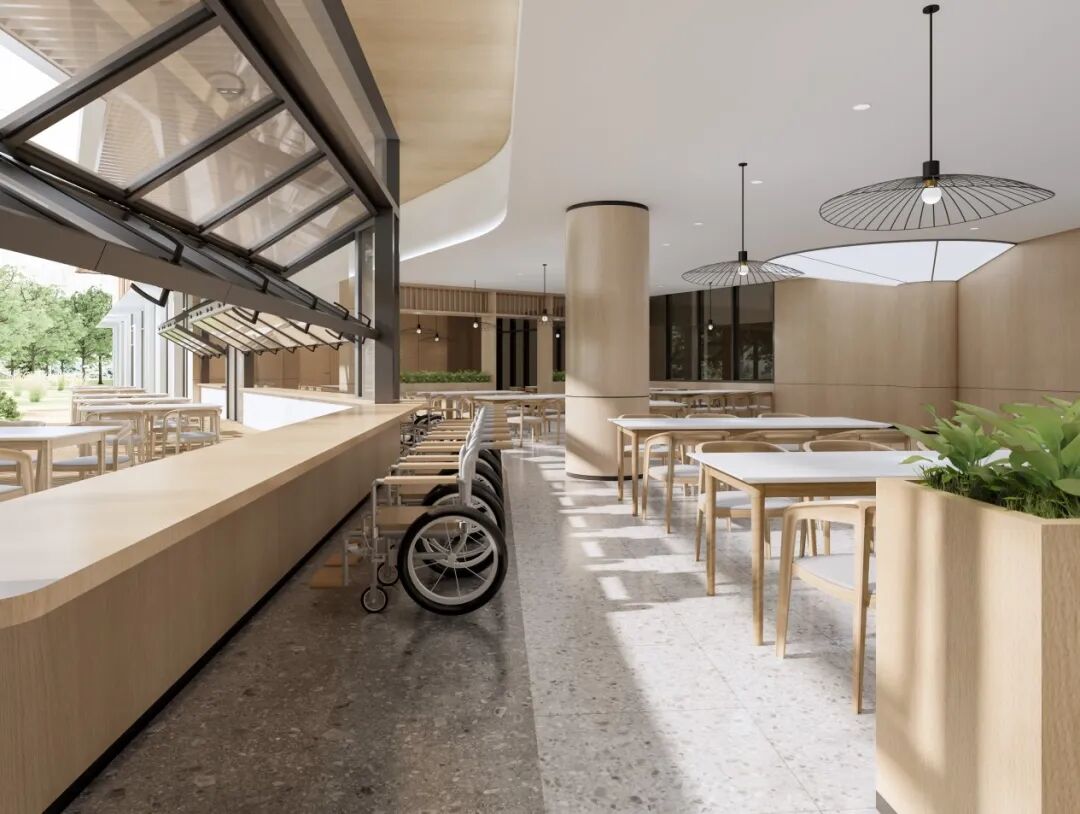在鹤山市澳乐康养院的设计中,设计师尝试加入了更多的脉脉温情:模糊的场所边界,互融的室内外景观,为长者提供可随时感知的四季变迁、春华秋实;引入立体街区式的康养配套理念,在有限的空间内实现功能的最大化复合,满足老年人多样化、个性化的养老需求;用心打磨细节,通过立面造型与室内设计,让他们在充满温度的居所中,继续享受美好无忧的生活。