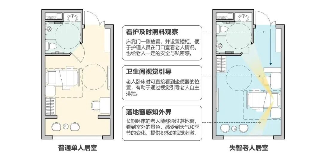 对于居室的设计,在同样的开间与进深尺寸下,为不同长者提供多种的生活可能性。尤其对于失智老人居室更多考虑他们的身体情况,既保证私密性,也兼顾看护的需求。家具陈设具有个人特征,便于他们能够辨认自己的房间与所处的环境。