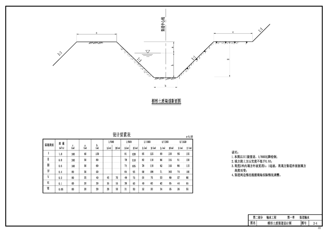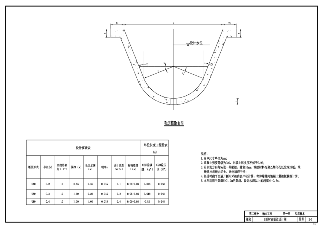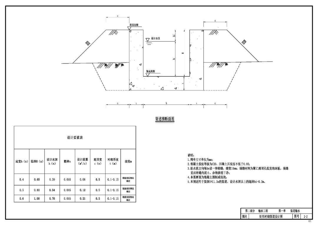 第一章 渠道输水 (1)根据项目区周边材料供应情况确定硬化方式。 (2)根据项目区具体情况,确定明渠输水渠道的断面形式。 (3)选用合理的水力参数。渠底比降应根据渠道沿线地形,地质条件,设计流量和含沙量等因素,通过计算分析确定,在满足渠道不冲不淤的条件下以较缓为宜;根据硬化方式确定明渠输水渠道的糙率。 (4)根据项目区用水要求选用合适的断面尺寸,并进行过水能力计算。渠道的纵横断面设计要保证设计输水能力、边坡稳定和水流安全通畅;各级渠道之间和渠道各分段之间及重要建筑物上下游水面平顺连接;末级渠道放水口的水位高出平整后田面进水口不少于10cm,且要保证施工运用和管理方便。
